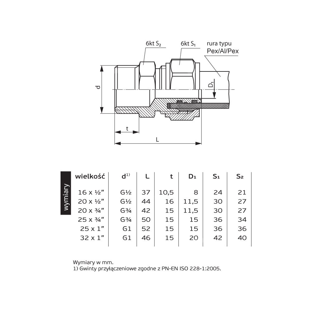 Złączka prosta skręcana QIK Do rur wielowarstwowych, mosiądz, 1'' x 32 mm (GW x złącze skręcane)