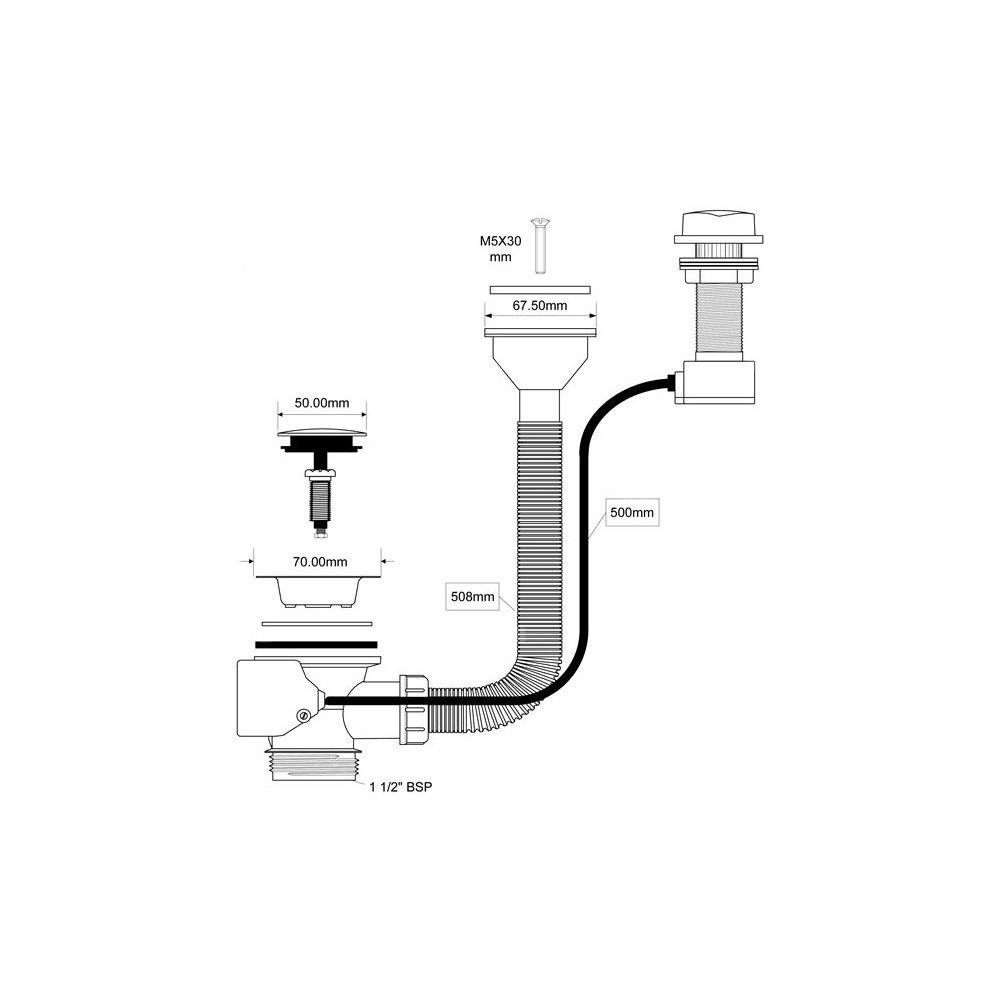 Spust zlewozmywakowy 1.1/2″x70mm z sitem ze stali nierdzewnej i korkiem automatycznym. Przelew z horyzontalnym podłączeniem do ociekacza.