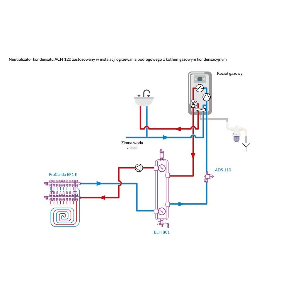 - Montowany pod kotłem na rurze odprowadzającej kondensat do kanalizacji, szamba lub przydomowej oczyszczalni ścieków.