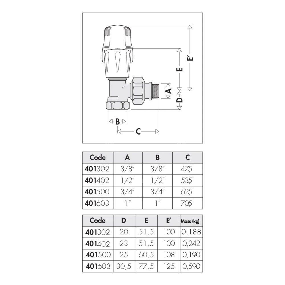 Kątowy grzejnikowy zawór termostatyczny z pokrętłem, przystosowany do montażu głowic termostatycznych, elektronicznych i siłowników termoelektrycznych Do rury żelaznej. podłącznie rury: G 3/8" (ISO 228-1) GW, wlot, podłączenie kątowe. podłączenie grzejnika: G 3/8" A (ISO 228-1) GZ, wylot, podłączenie kątowe. Maksymalne ciśnienie pracy: 10 bar. Zakres temperatury medium: 5–100 °C. Wykończenie: chromowane. Kv: 2,22 m³/h. Materiał: mosiądz.