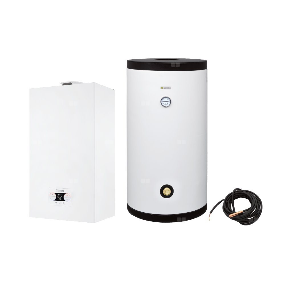 Gazowy kocioł kondensacyjny Beretta Quadra 25 R. z zasobnikiem c.w.u. Kwadro TOP 120 lub Idra TOP 120 lub Idra 100 SV albo zasobnikiem c.w.u. Vulcan 100 lub Vulcan 120 lub Vulcan 140 lub Vulcan 200 w wersji wiszącej lub stojącej i sondą NTC do zasobnika c.w.u. oraz opcjonalnie z sondą zewnętrzną, programatorem tygodniowym BeSMART, kostką przyłączeniową sondy i programatora oraz pełną konsolą przyłączy z zaworami odcinającymi c.o. z filtrem i zaworem odcinającym gaz.