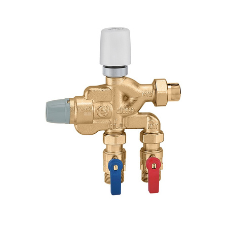 Wielofunkcyjne, kompaktowe urządzenie do regulacji temperatury, dezynfekcji termicznej i dystrybucji c.w.u. Wersja bez obejścia zimnej wody Zawiera: - termostatyczny, antyoparzeniowy zawór mieszający; - automatyczny zawór z siłownikiem termoelektrycznym umożliwiający wykonanie dezynfekcji termicznej; - kulowy zawór odcinający z wbudowanymi filtrami i zaworami zwrotnymi. Siłownik termoelektryczny - normlanie zamknięty. Do zastosowania w instalacjach z kranami aktywowanymi przyciskiem lub fotokomórką. Wydajność zgodnie z NF 079 dok. 8,EN 1111 i EN 1287. Przyłącze: G 3/4" A (ISO 228-1) GZ. Maksymalne ciśnienie pracy: 10 bar. Zakres temperatury medium: 5–85 °C. Zakres regulacji temperatury: 30–50 °C. Nastawa: 43 °C. Zasilanie elektryczne: 230 V (AC). Pobór mocy: 3 W. Stopień ochrony: IP 44. Długość przewodu zasilająego: 0,8 m. Kv zawór mieszający: 1,75 m³/h. Kv zawór płuczący: 1,80 m³/h. Materiał: stop mosiądzu odporny na odcynkowanie.