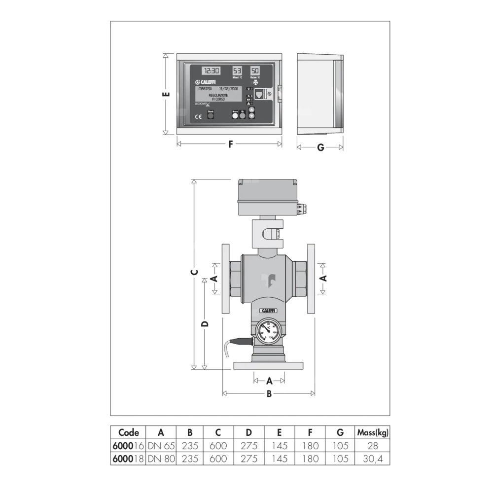 Elektroniczny zawór mieszający z programowalną dezynfekcją termiczną i dezynfekcją kontrolną 24 V. Przyłącza kołnierzowe PN 16. Z mikroprzełącznikiem pomocniczym Zawiera: -trójdrożny zawór kulowy; -siłownik; -regulator; -czujnik temperatury wody zmieszanej; -czujnik temperatury wody cyrkulacyjnej. Przyłącze: DN 80 (EN 1092-1) PN 16. Maksymalne ciśnienie pracy: 10 bar. Zakres temperatury medium: 0–100 °C. Zakres regulacji temperatury: 20–85 °C. Zakres temperatury dezynfekcji: 40–85 °C. Zasilanie elektryczne: 24 V (AC). Pobór mocy: (6,5+10,5) VA. Stopień ochrony: IP 65. DN: DN 80 (korpus). Kv: 105,0 m³/h.