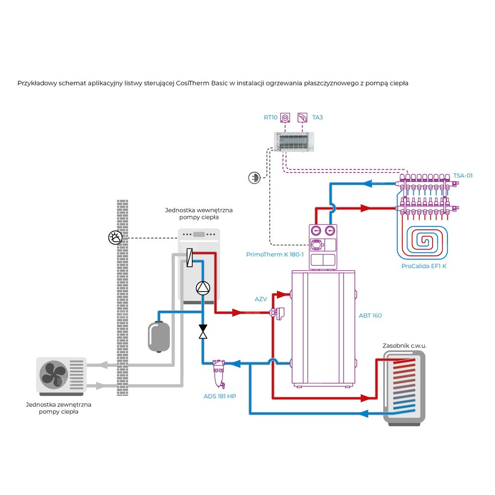 - Reguluje temperaturę w pomieszczeniach na podstawie sygnałów z termostatów pokojowych.