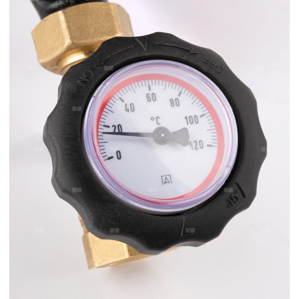 Termometr wbudowany w pokrętło zaworu odcinającego kontroluje temperaturę medium.