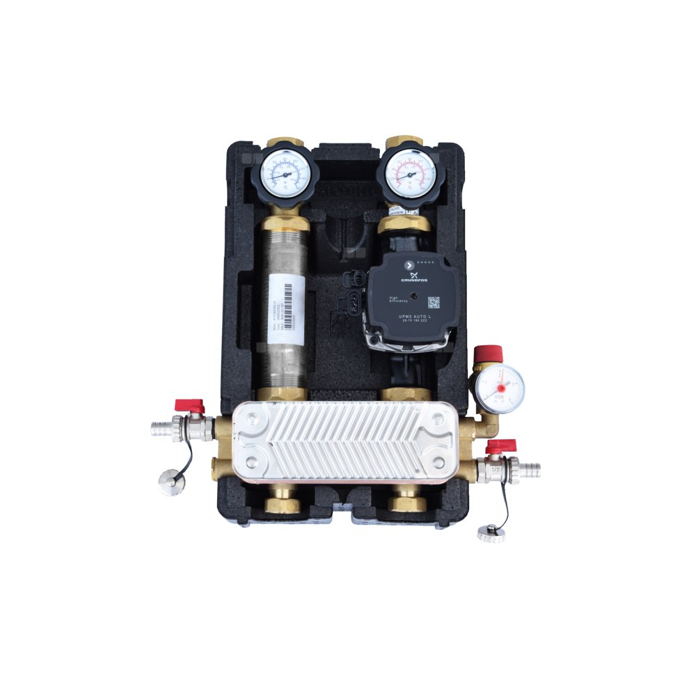 Grupa pozwalajaca na oddzielenia dwóch źródeł ciepła, z płytowym wymiennikiem ciepła.