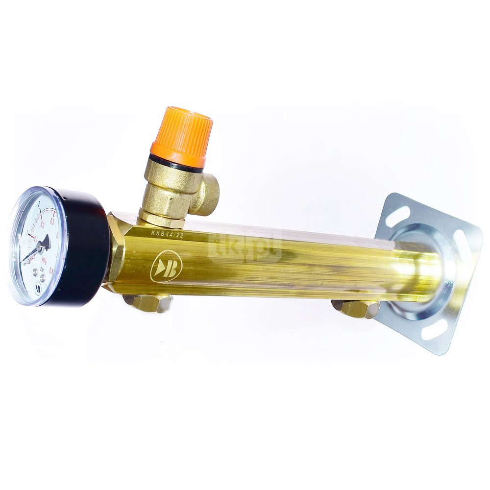 Grupy bezpieczeństwa CO QIK mosiężna, 3 bar i 6 bar z odpowietrznikiem manualny lub odpowietrznikiem automatycznym do zabezpieczenia instalacji wodnych, przed nadmiernym wzrostem ciśnienia. Aksjalny manometr ułatwia monitorowanie ciśnienia bez względu na miejsce montażu grupy bezpieczeństwa. Wydłużona belka grupy umożliwia współpracę nawet z dużymi naczyniami wzbiorczymi. Wyposażenie: belka mosiężna, zawór bezpieczeństwa, manometr tarczowy, zawór zwrotny z kontrnakrętką umożliwia szybkie ustawienie wypływu, odpowietrznik manualny lub automatyczny, solidna stalowa blacha montażowa z otworami typu fasolka. Przyłącza 3/4” GZ, rozstaw przyłączy 180mm. Wymiary zewnętrzne: wysokość 130/155mm, długość 320mm, głębokość 100mm.