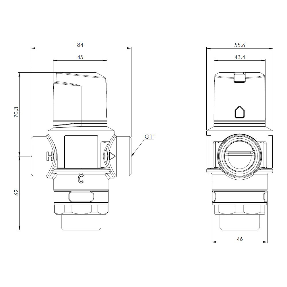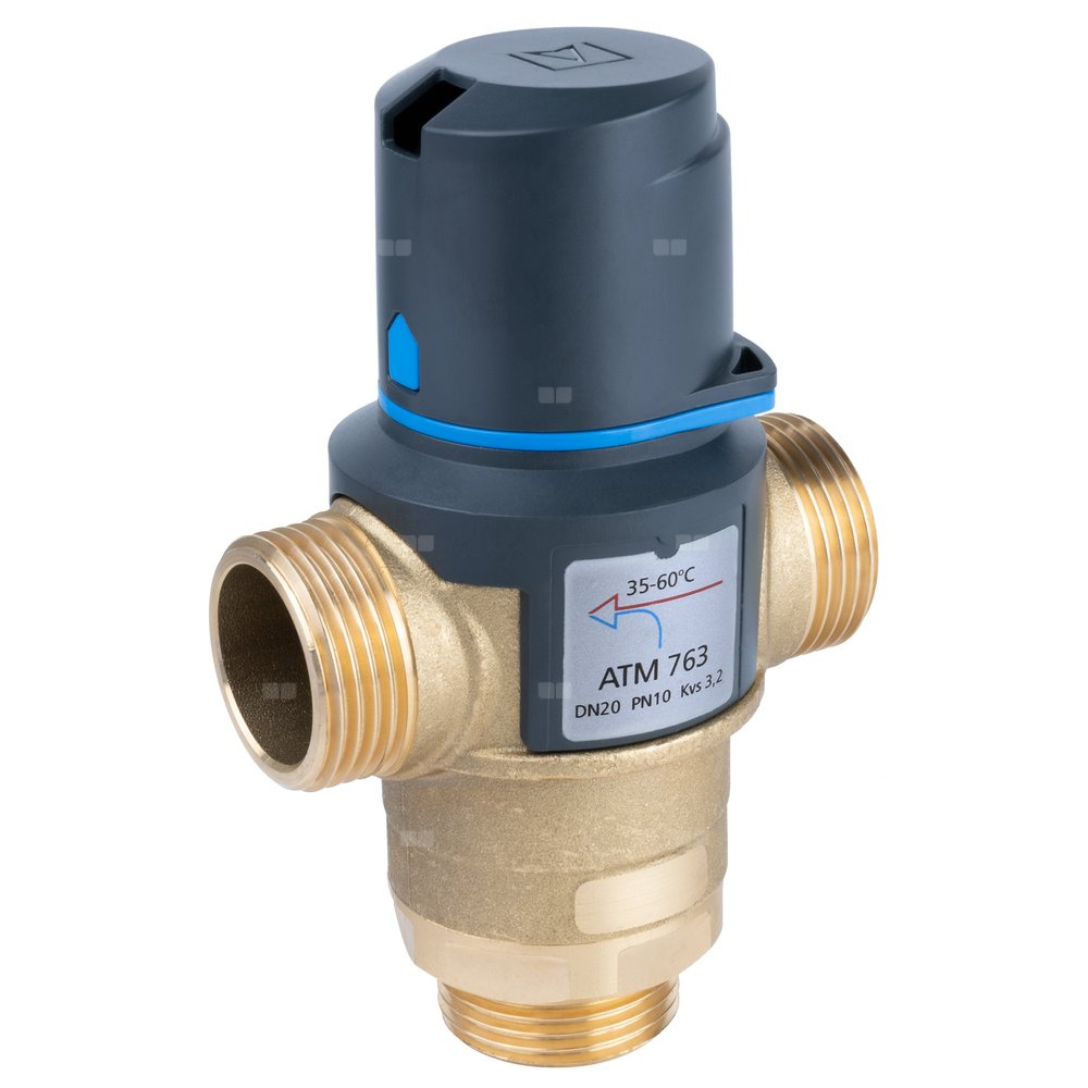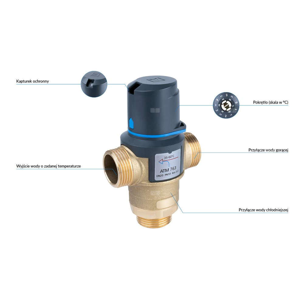 Zawór regulacyjny termostatyczny do wody ciepłej AFRISO ATM 763 mosiądz GZ 1'', DN 20, zakres temp. 35-60'C, Kvs 3.2 m3/h, maksymalna temperatura 110'C, maksymane ciśnienie 10 bar