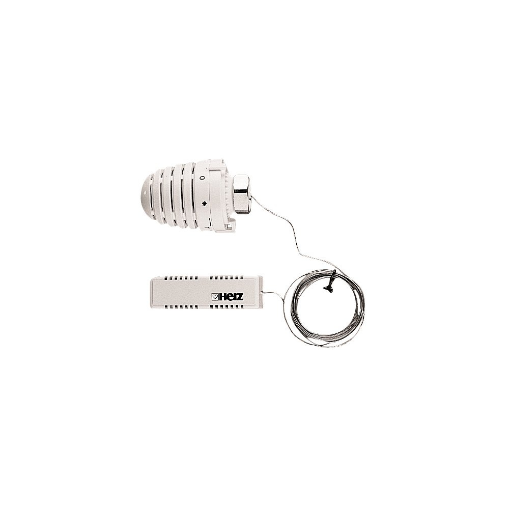 Głowica termostatyczna HERZ-Design "H" z czujnikiem zdalnym składająca się z termostatu z czujnikiem cieczowym zdalnym i kapilary, zakres nastaw 6 - 30 °C, z mechanicznym zamknięciem („0"), zabezpieczenie przed mrozem przy ok. 6 °C. Możliwość ograniczenia i blokady nastaw za pomocą sztyftów blokujących 1 9551 00 (oddzielnie do zamówienia). Długość kapilary 2 m.