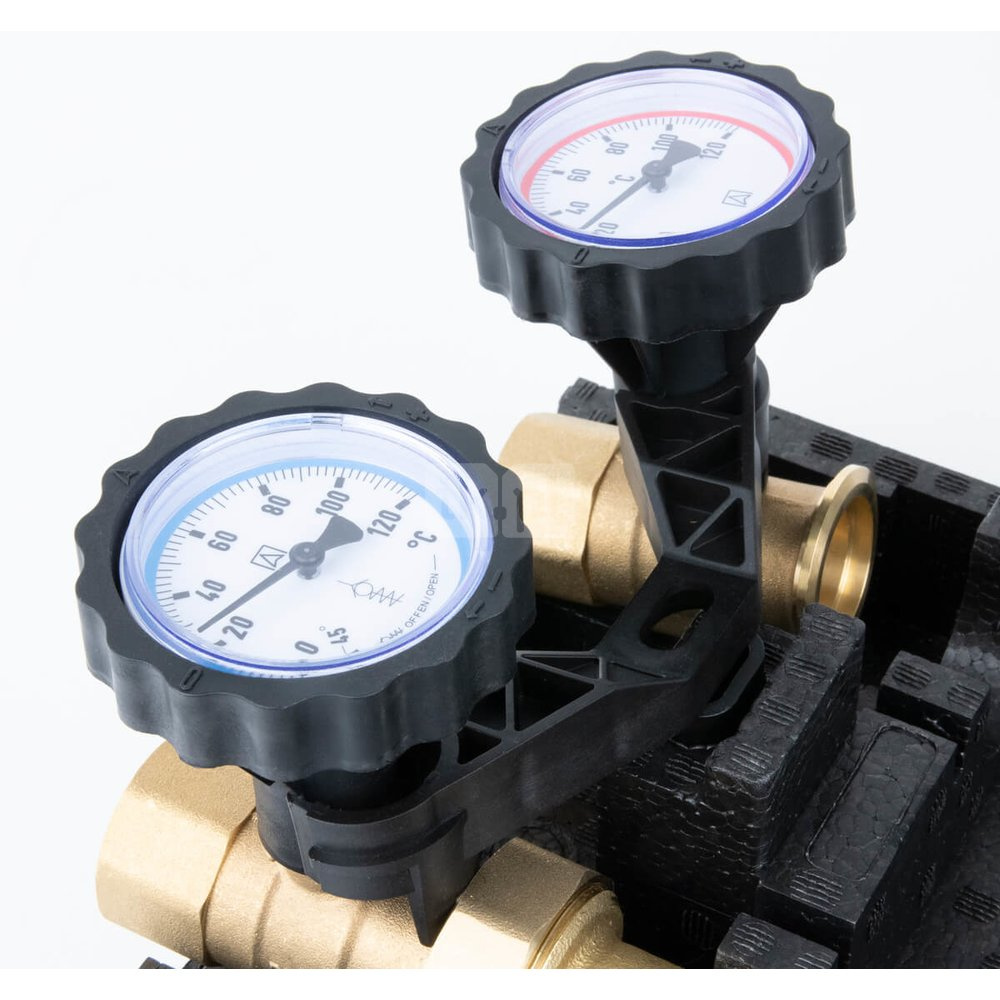 - Wyposażona w niezbędne komponenty: termometry, zawór zwrotny, zawory odcinające na zasilaniu i powrocie, zawór odcinający przed pompą i izolację termiczną.