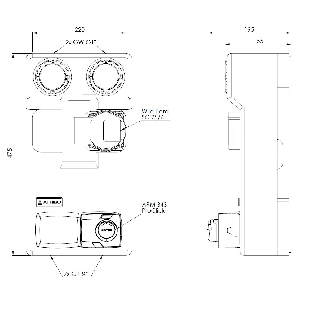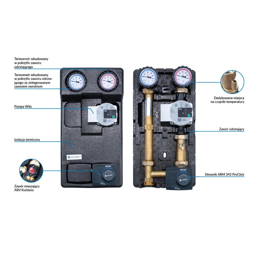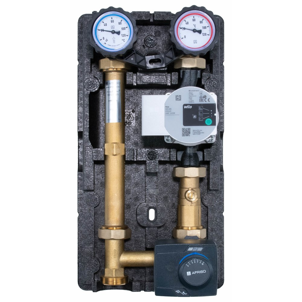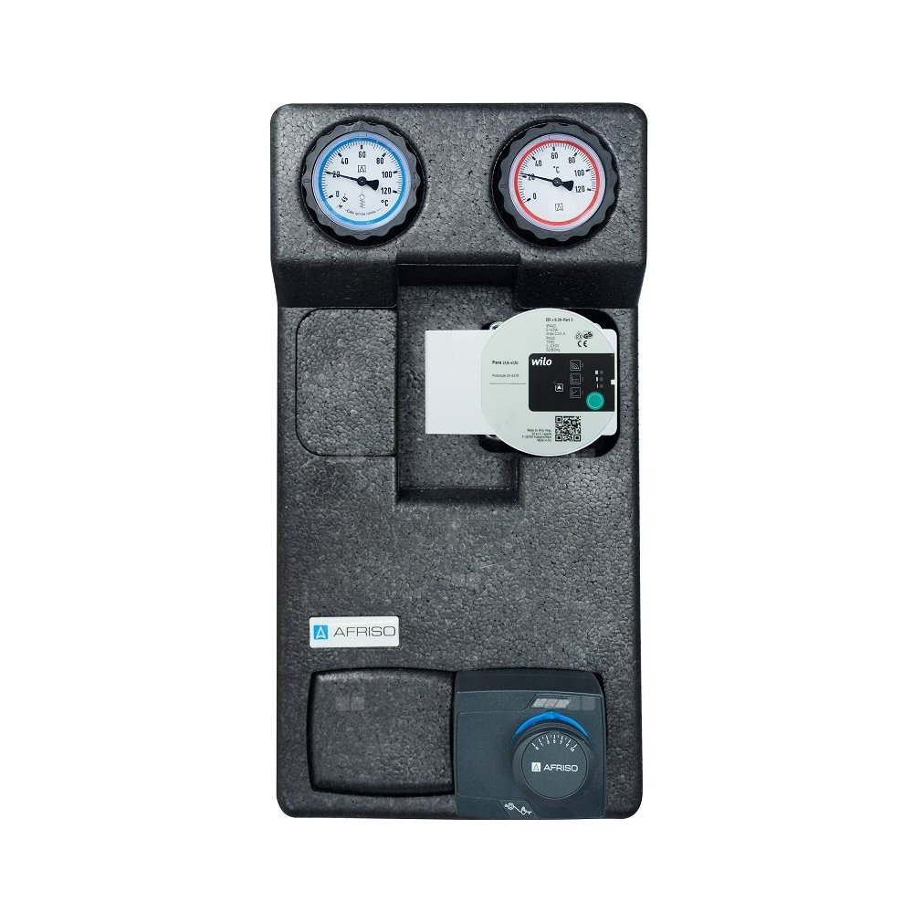 Grupa pompowa AFRISO PrimoTherm 180-2 DN 25 WP 3-WM-SM Vario GZ x GW 1 1/2'' x 1'', z zaworem mieszającym, z izolacją, z pompą obiegową Wilo Para SC 25/6, z siłownikiem arm 343 proclick