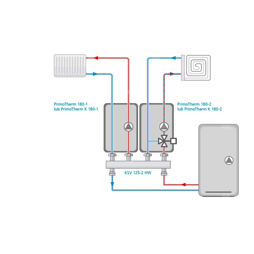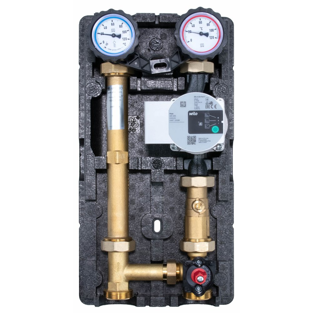 Grupa pompowa PrimoTherm 180-2 Vario z pompą Wilo ParaGrupa pompowa PrimoTherm 180-2 Vario to gotowy zespół urządzeń i armatury, przeznaczony do przetłaczania medium w instalacji grzewczej oraz regulacji temperatury zasilania.W skład grupy wchodzą zawory odcinające z termometrami w pokrętłach, zawory odcinające z zaworem przeciwgrawitacyjnym, pompa Wilo Para oraz zawór mieszający ARV KVSvario ze zmiennym współczynnikiem przepływu Kvs wyposażony w siłownik elektryczny ARM ProClick. Wartość Kvs zaworu może być ustawiona w zakresie 2,5÷12 m3/h. Całość znajduje się w estetycznej izolacji termicznej.Dzięki modułowej budowie grupy możliwa jest zamiana stronami zasilania i powrotu.