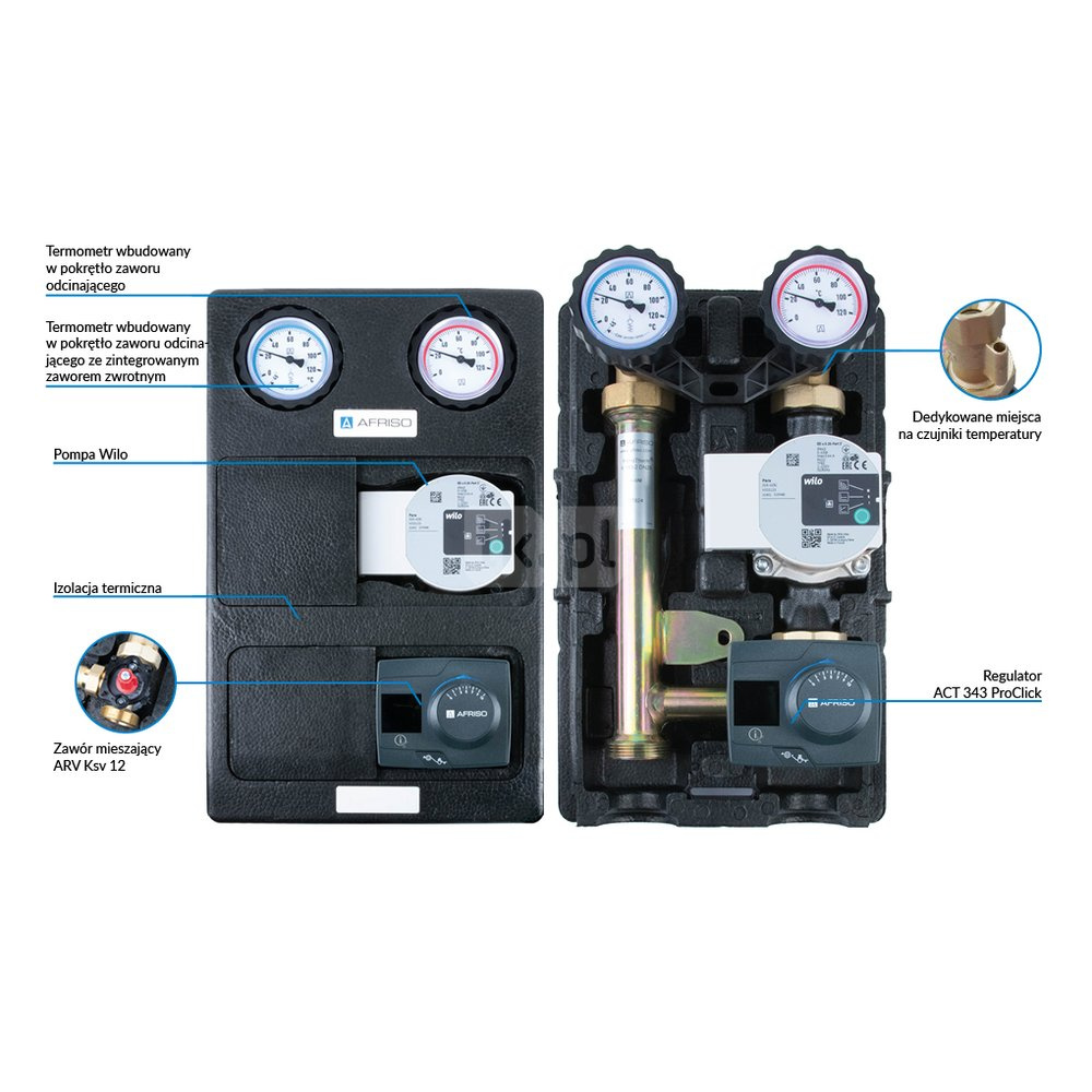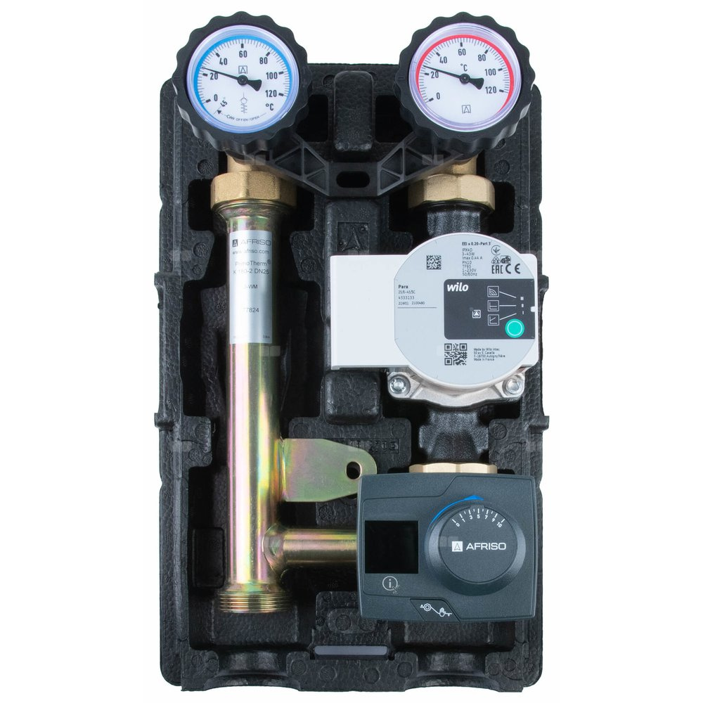 Grupa pompowa AFRISO PrimoTherm K 180-2 DN 25 WP 3-WM-R GZ x GW 1 1/2'' x 1'', z zaworem mieszającym, z izolacją, z pompą obiegową Wilo Para SC 25/6