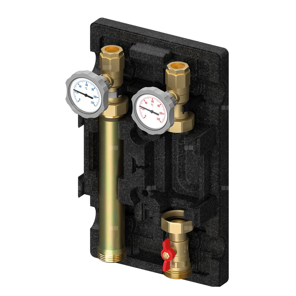 Kompletna, z pompą lub bez pompy obiegowej (dł. 180 mm), z 2-metrowym przewodem elektrycznym, dwoma zaworami kulowymi 2-drogowymi, z gniazdem termometru, z zaworem zwrotnym z ręczną blokadą z dwoma termometrami kontaktowymi, z zaworem kulowym przed pompą, ze śrubunkami pompowymi i częścią rurową, konsolą ścienną, izolacją EPP, wszystko zmontowane i sprawdzone ciśnieniowo.