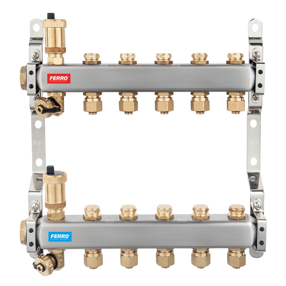 Rozdzielacz 11-drogowy (do systemów c.o. i c.w.u.) z zaworami odcinającymi obwody, ze złączkami, stal nierdzewna