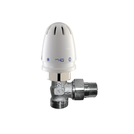 Głowica termostatyczna kątowa do zaworów HERZ, zakres reg. 25-60'C, przyłącze GZ 1/2 x GZ 3/4, kolor biały