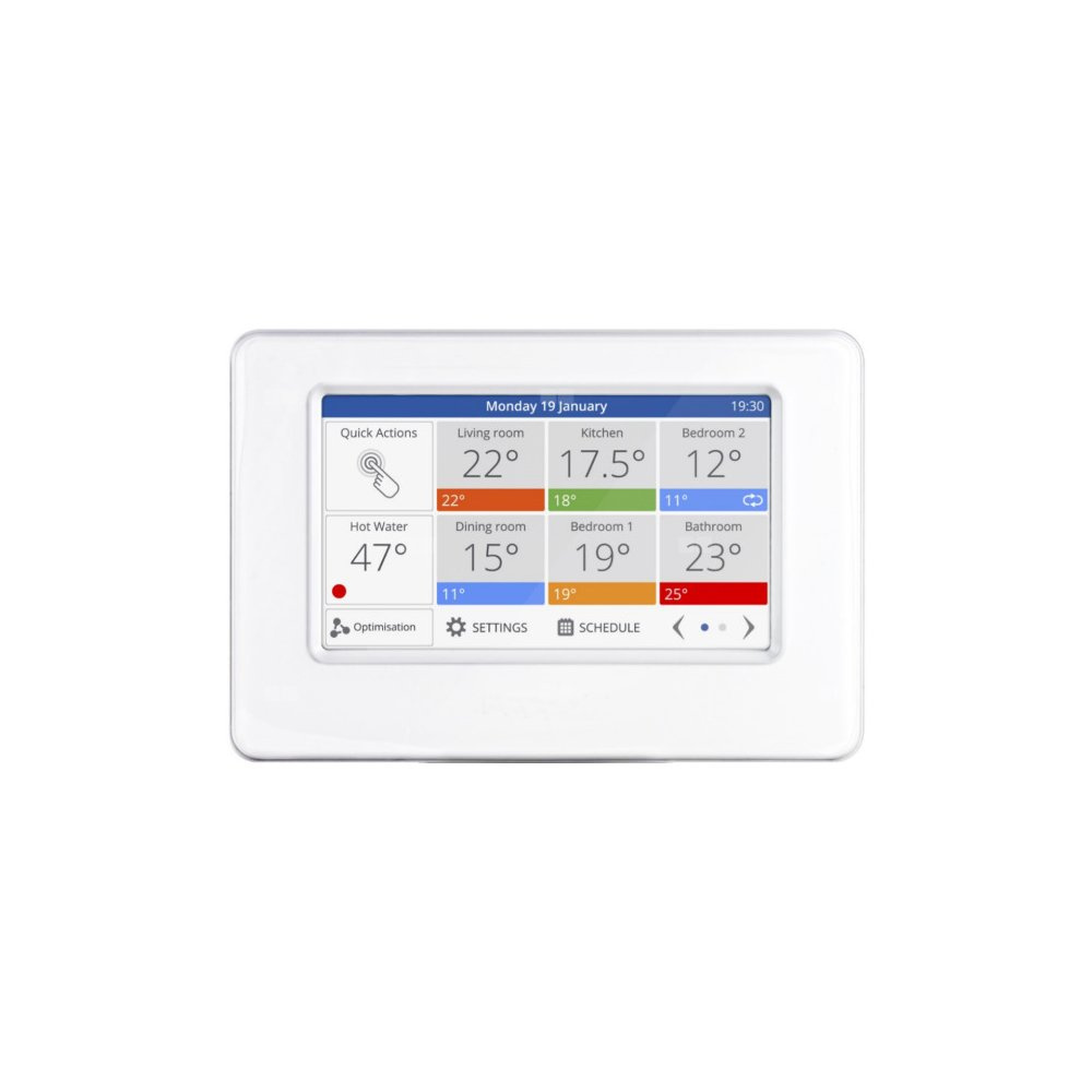 Moduł sterujący może sterować niezależnym programem czasowo-temperaturowym w maks. 12 strefach grzewczych oraz w jednym obiegu ciepłej wody. Moduł sterujący evohome może być wykorzystywany w wielu konfiguracjach. Jako bezprzewodowy system sterowania wielostrefowego w większych instalacjach zapewnia wiele korzyści ale również znajduje zastoso-wanie w mniejszych systemach. Wbudowane funkcje optymalizacji pozwalają osiągnąć oszczędności i komfort poprzez załączenie z wyprzedzeniem lub wyłączanie z opóźnieniem ogrzewania oraz dopasowanie do pogody, która dokładnie reguluje komfort strefy i zużycie energii w oparciu o temperaturę zewnętrzną, temperaturę w pomieszczeniu i wartość zadaną przez użytkownika.Intuicyjne i łatwe w obsłudze menu zapewnia dostęp do wszystkich funkcji systemu poprzez wysokiej jakości kolorowy wyświetlacz z funkcją dotykową. Moduł sterujący evohome standardowo ma wbudowaną bramkę internetową, która umożliwia zdalne sterowanie systemem ze smartfona lub tabletu. Wymagane oprogramowanie Android lub iOS.