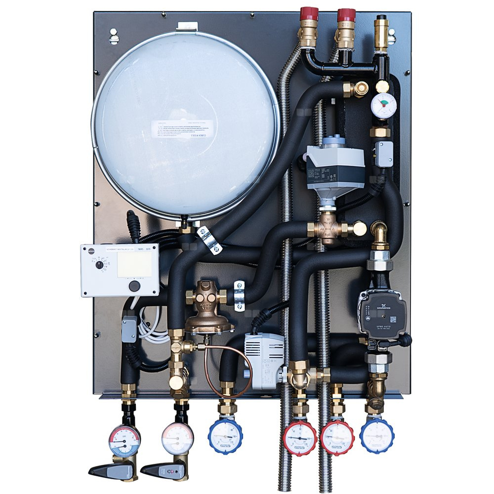 Składa się z: zaworów kulowych odcinających z regulacją przepływu, zaworu różnicy ciśnień wymiennika 30-płytowego, zaworu regulacyjnego, 3-drogowego zaworu z siłownikiem, 2 zaworów bezpieczeństwa c.o. 3 bary, manometrów, termometrów, pompy UPML AUTO L 25-95 , obudowy, zaworu regulacyjnego z siłownikiem, naczynia przeponowego 18 I, sterownika pogodowego, izolacji. Max. moc dla c.o. 50 kW.