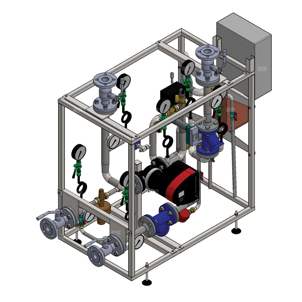 Składa się z: spawanych zaworów odcinających po stronie sieciowej, połączenia gwintowane armatury, zaworu różnicy ciśnień z ograniczeniem przepływu, zaworu regulacyjnego, siłownika ze sprężyną powrotną, pompy typu Magna, regulatora pogodowego, termometrów, manometrów, zaworu bezpieczeństwa, termostatu bezpieczeństwa, izolacji prostych odcinków przewodów i wymiennika, ręcznego układu uzupełniania zładu. Zabudowa w ramie stalowej. Gwarancja 12 miesięcy.