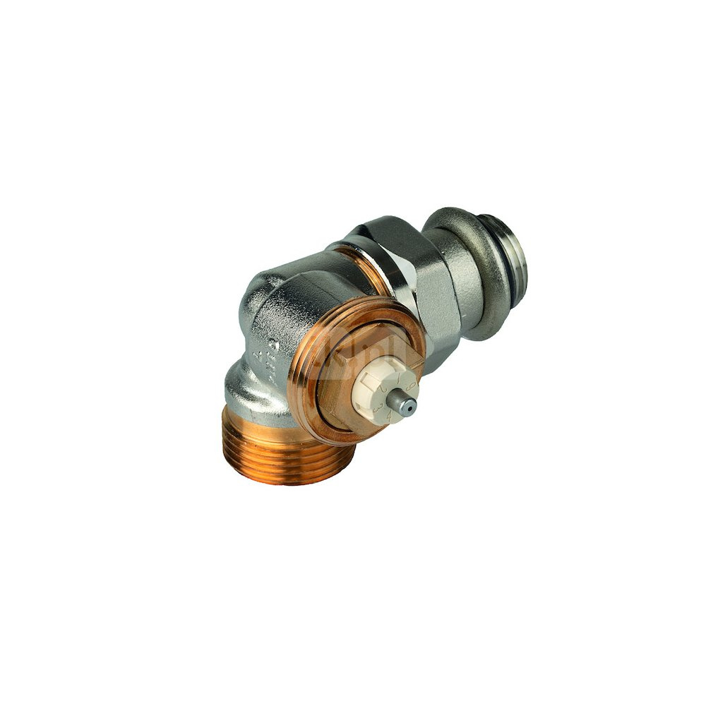 Zawór termostatyczny, narożny lewy, wkładka SX, DN15, gwint zewnętrzny 3/4", ze złączką do grzejnika z uszczelnieniem miękkim