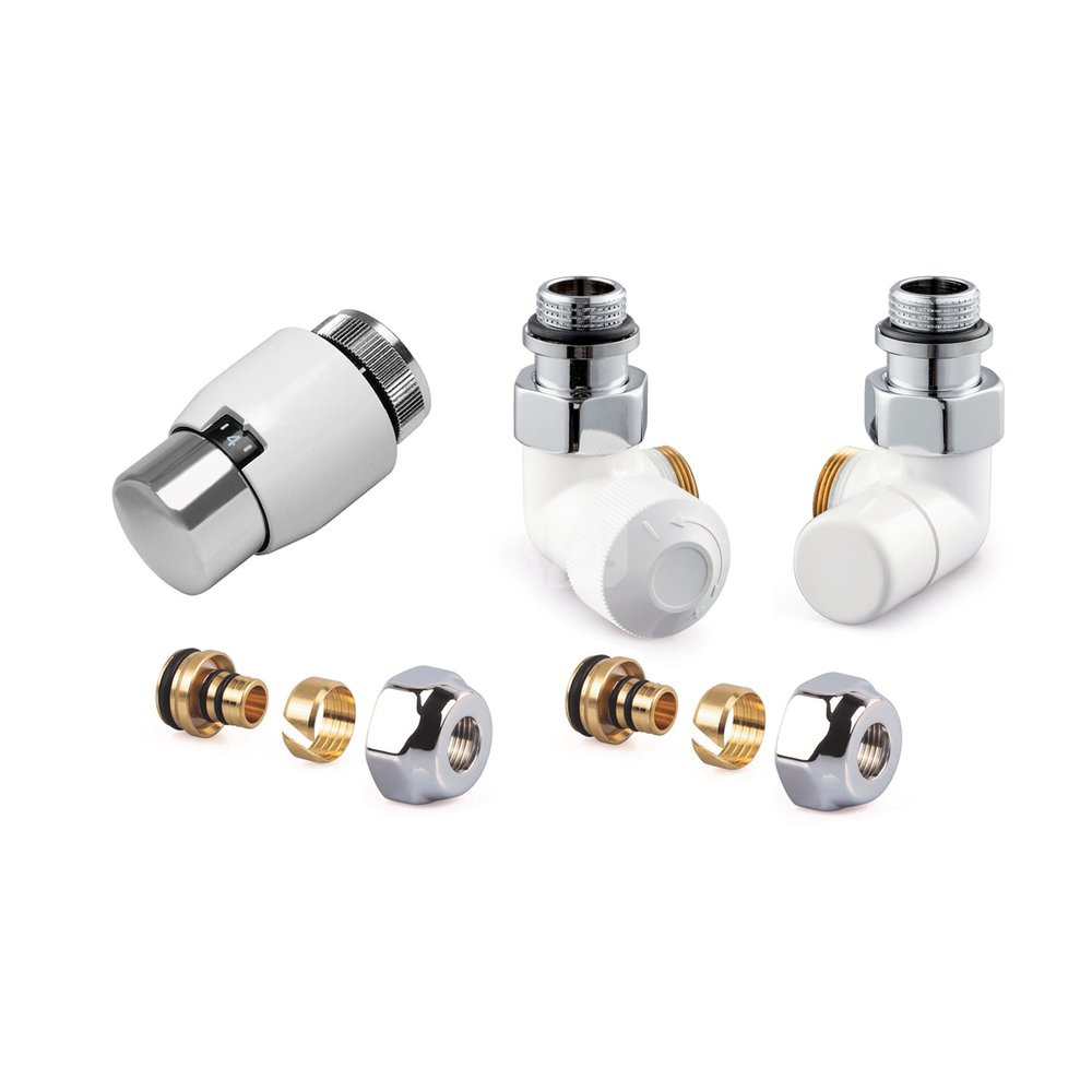 Zestaw BIAŁY do grzejników bocznozasilanych: głowica Thera-200 (biała/chrom) T4021 + Zawór termostatyczny, biały, narożny, lewy, 1/2" V2081LSL15A + zawór powrotny narożny, prawy, 1/2" V2481R0015A + 2x złączka do rur wielowarstwowych FEM24M16X2