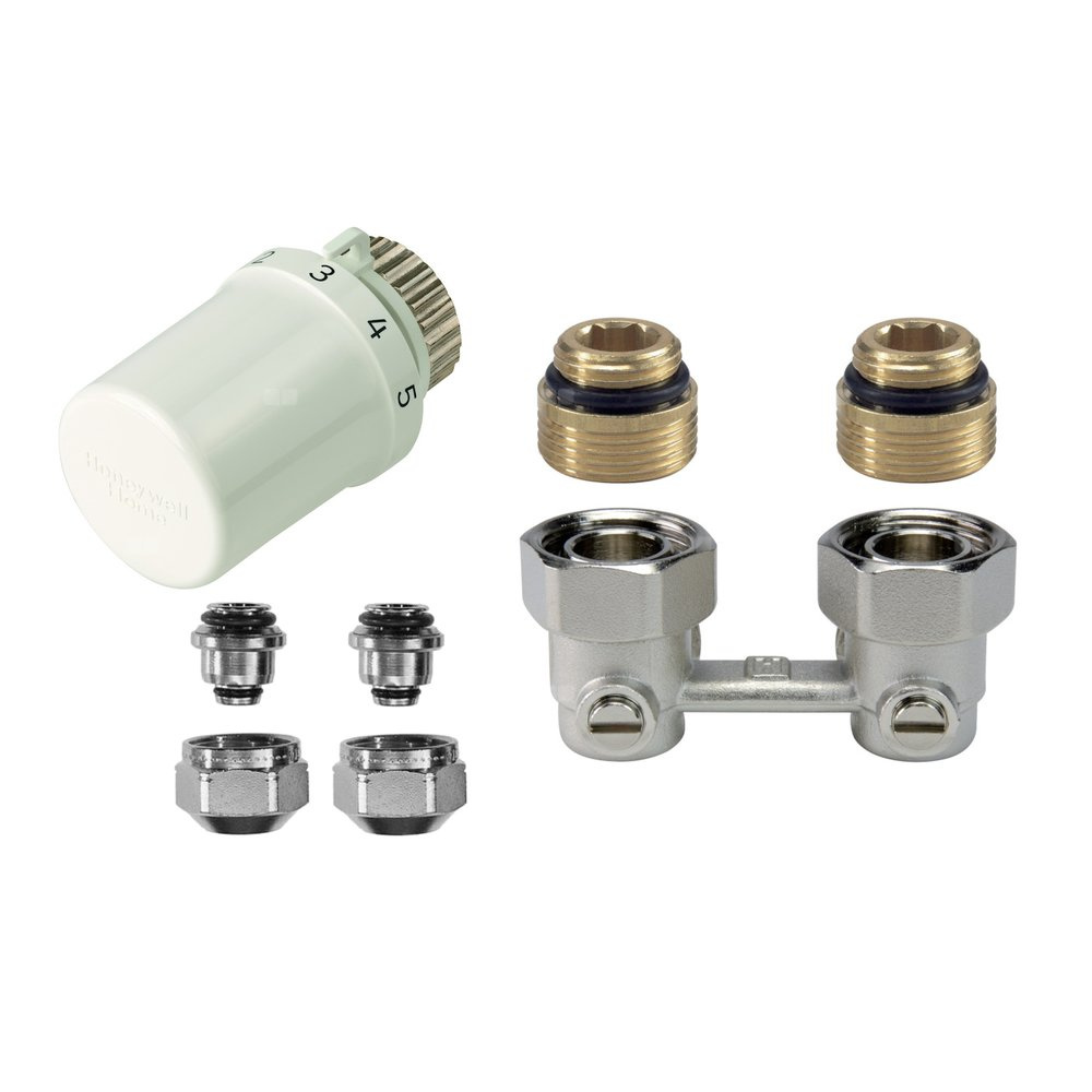 Zestaw do grzejników dolnozasilanych: głowica Thera-6 T3019W0 + zawór podwójny, kątowy, podwójny z odcięciem, 1/2" V2495EY015A + złączka do rur wielowarstwowych OT113M-3/4F