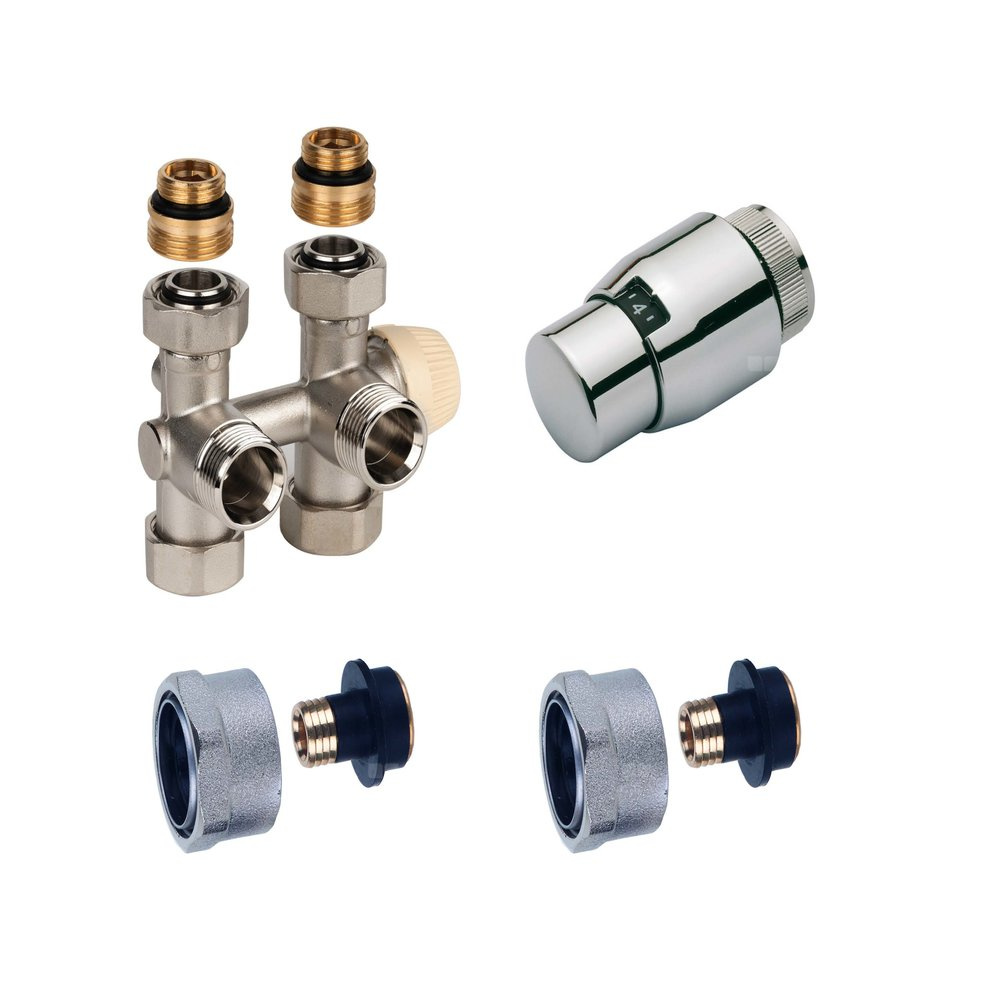2. Zawór podwójny Therafix Universal, kolor chrom, typ przyłącza grzejnika 3/4” gw. zewn., z Euroconus