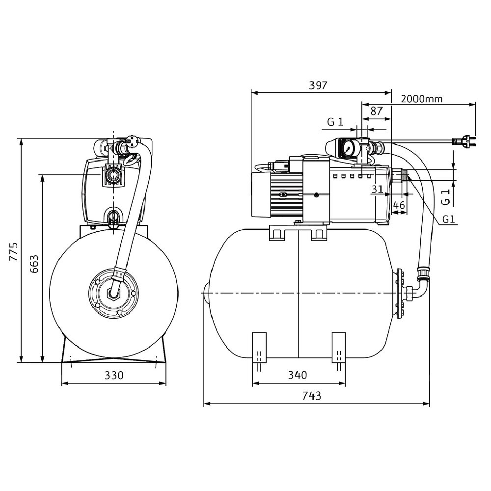 Dwubiegunowy silnik jednofazowy z dławikiem przewodu, kondensatorem w skrzynce przyłączowej, wyłącznikiem zabezpieczenia silnika z automatycznym ponownym włączeniem, manometrem, przełącznikiem ciśnieniowym, elastycznym wężem ciśnieniowym i przewodem sieciowym z wtyczką