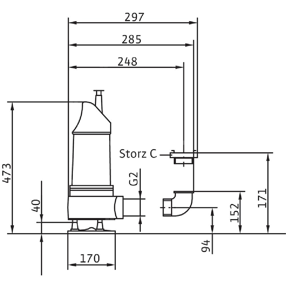 Całkowicie zanurzona pompa zatapialna do wody zanieczyszczonej, pionowe ustawienie mokre, do tłoczenia wody zanieczyszczonej i zawierającej piasek Korpus hydrauliczny i wirnik z żeliwa szarego, korpus silnika z aluminium. Przyłącze tłoczne z pionowym odpływem ciśnieniowym i złączem typu Storz. Samochłodzący silnik w wersji na prąd zmienny jednofazowy, z odłączanym kablem zasilającym i wyłącznikiem pływakowym z wtyczką z uziemieniem i kondensatorem roboczym. Do uszczelnienia po stronie medium i silnika służy uszczelnienie mechaniczne. Agregat można stosować w podsysającym trybie pracy bez ograniczeń.