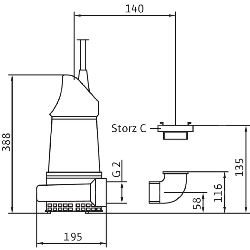 Całkowicie zanurzona pompa zatapialna do wody zanieczyszczonej, pionowe ustawienie mokre, do tłoczenia wody zanieczyszczonej i zawierającej piasek Korpus hydrauliczny i wirnik z żeliwa szarego, korpus silnika z aluminium. Przyłącze tłoczne z pionowym odpływem ciśnieniowym i złączem typu Storz. Samochłodzący silnik w wersji na prąd zmienny jednofazowy, z odłączanym kablem zasilającym i wtyczką z uziemieniem i kondensatorem roboczym. Do uszczelnienia po stronie medium i silnika służy uszczelnienie mechaniczne. Agregat można stosować w podsysającym trybie pracy bez ograniczeń.