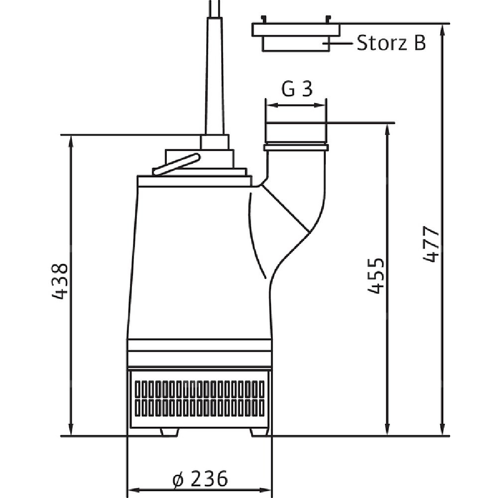 Całkowicie zanurzona pompa zatapialna do wody zanieczyszczonej, pionowe ustawienie mokre, do tłoczenia wody zanieczyszczonej i zawierającej piasek Korpus hydrauliczny i wirnik z żeliwa szarego, korpus silnika z aluminium. Przyłącze tłoczne z centrycznym i pionowym odpływem ciśnieniowym i złączem typu Storz. Silnik chłodzony powierzchniowo w wersji na prąd trójfazowy z chłodzeniem płaszczowym i komorą uszczelnienia. Rozłączny kabel zasilający z wtyczką wg standardu CEE z funkcją zamiany faz. Uszczelnienie zapewniają dwa niezależne od kierunku obrotów uszczelnienia mechaniczne. Agregat można stosować w podsysającym trybie pracy bez ograniczeń.