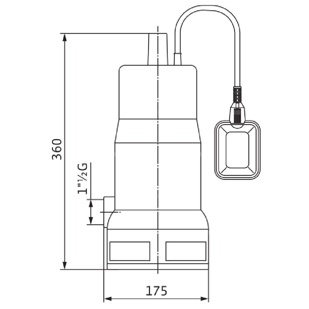 Sewage pump with vortex impeller and vertical threaded connection. Pump housing and impeller made of composite material. 1~ motor with integrated operating capacitor, self-switching thermal motor monitoring, and basic sealing with a rotary shaft seal. Motor housing made of steel. Connection cable with float switch and fitted plug (CEE 7/7).