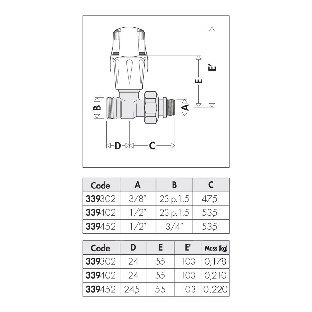 Prosty grzejnikowy zawór termostatyczny z pokrętłem przystosowany do montażu głowic termostatycznych, elektronicznych i siłowników termoelektrycznych. podłącznie rury: G 3/4" A (ISO 228-1) GZ, wlot, podłączenie proste, Podłączenie do złączek Caleffi. podłączenie grzejnika: G 1/2" A (ISO 228-1) GZ, wylot, podłączenie proste. Maksymalne ciśnienie pracy: 10 bar. Zakres temperatury medium: 5–100 °C. Wykończenie: chromowane. Kv: 1,79 m³/h. Cv: 2.0 gpm. Materiał: mosiądz.