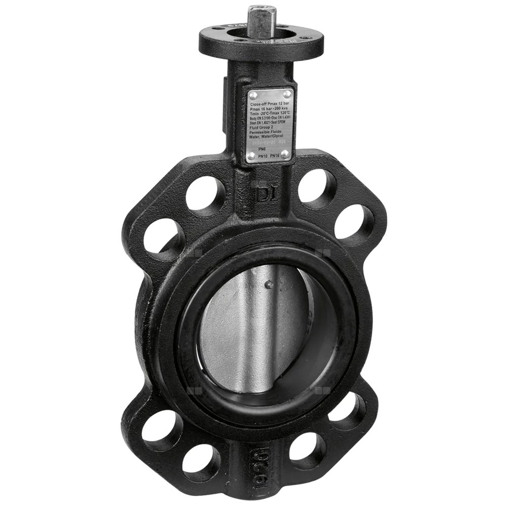 Przepustnica typu WAFER Do współpracy z przeciwkołnierzami płaskimi PN 6/10/16 - EN 1092-1. Przyłącze: DN 80 (EN 1092-1) PN 16. Maksymalne ciśnienie pracy: 16 bar. Zakres temperatury medium: -20–120 °C. Kv: 260 m³/h. Materiał: żeliwo.