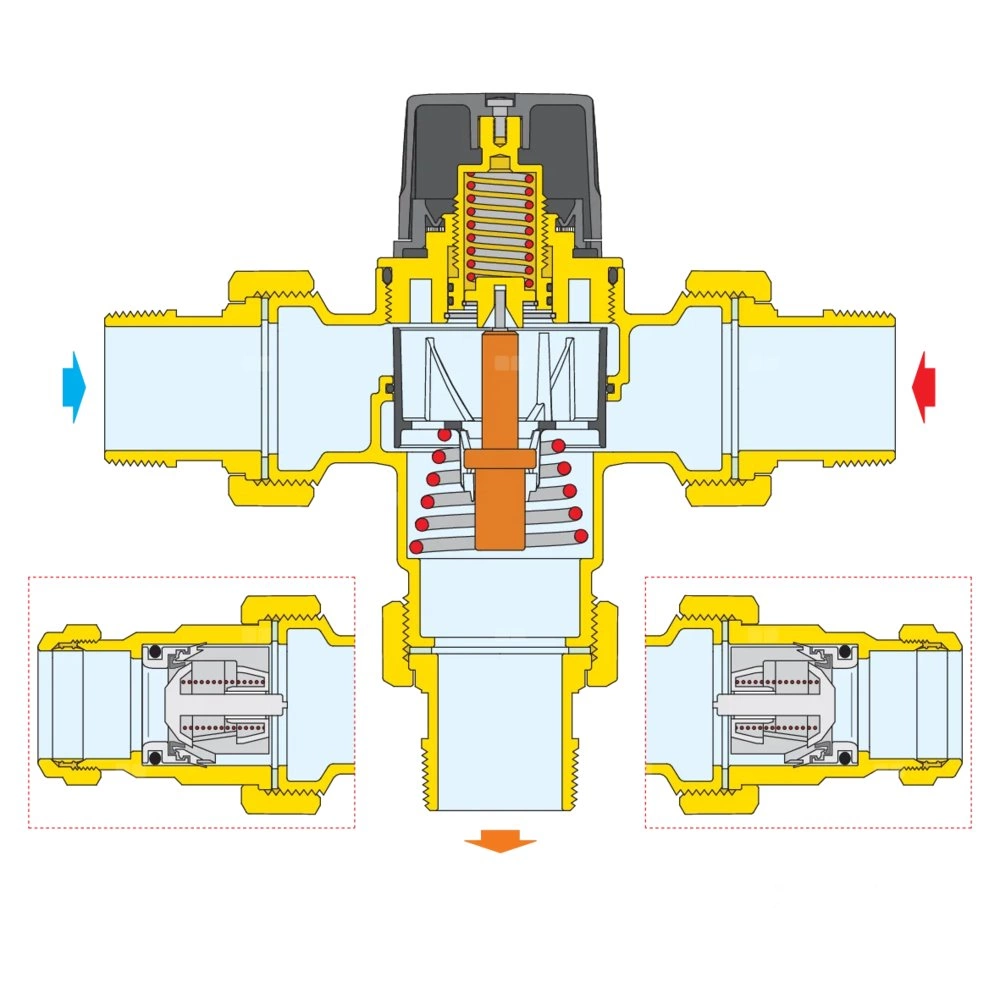 Regulowany termostatyczny zawór mieszający do systemów scentralizowanych. Korpus wykonany ze stopu cynku 3/4'' 35÷65'C