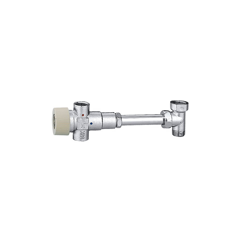 Regulowany termostatyczny zawór mieszający do zasobników c.w.u. Przyłącze: G 1/2" (ISO 228-1) GW. Maksymalne ciśnienie pracy: 10 bar. Zakres temperatury medium: 2–90 °C. Zakres regulacji temperatury: 30–48 °C. Wykończenie: chromowane. Kv: 1,30 m³/h. Materiał: mosiądz.