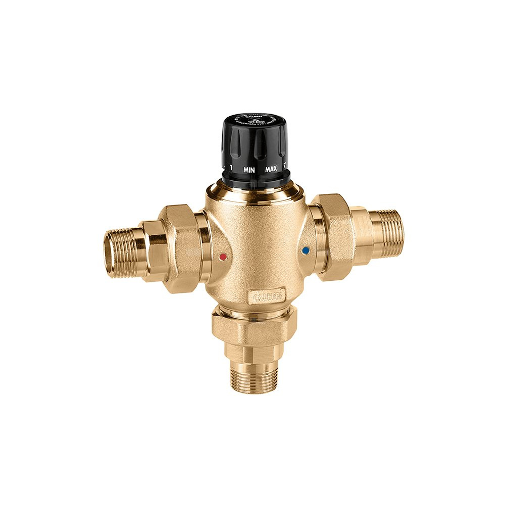 Regulowany termostatyczny zawór mieszający z wymiennym wkładem do systemów scentralizowanych Przyłącze: G 3/4" A (ISO 228-1) GZ. Maksymalne ciśnienie pracy: 14 bar. Zakres temperatury medium: 2–85 °C. Zakres regulacji temperatury: 30–65 °C. Kv: 4,5 m³/h. Materiał: mosiądz.