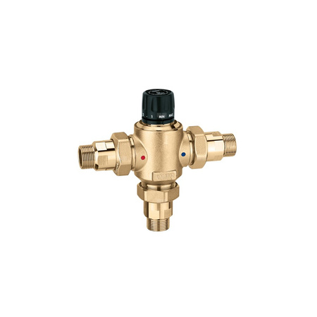 Regulowany termostatyczny zawór mieszający z wymiennym wkładem do systemów scentralizowanych. Z zaworami zwrotnymi 1/2"