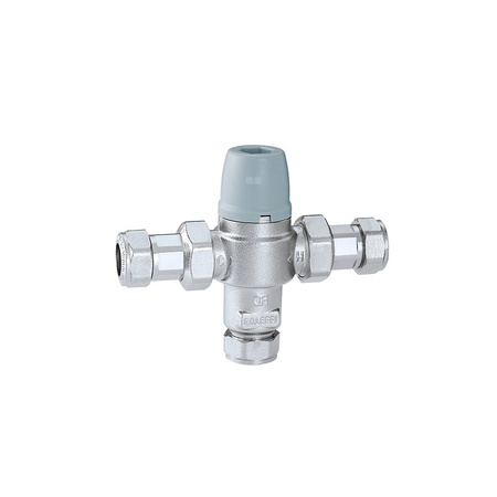 Regulowany, termostatyczny zawór mieszający z zaworami zwrotnymi, filtrami i złączkami zaciskowymi O 22 30–50 st. C