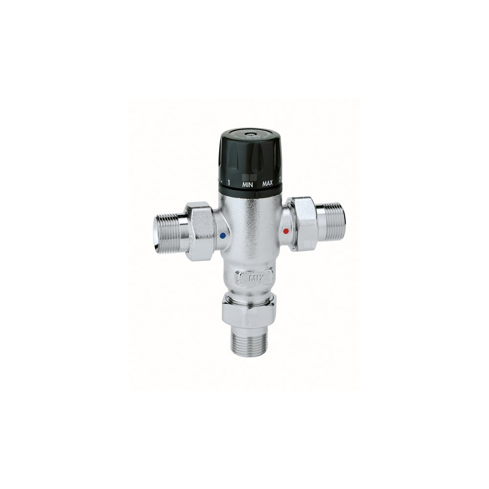 Regulowany termostatyczny zawór mieszający z zaworami zwrotnymi, filtrami na wlotach i złączkami zaciskowymi Certyfikat EN 1287. Przyłącze: Ø 22. Maksymalne ciśnienie pracy: 14 bar. Zakres regulacji temperatury: 30–65 °C. Maksymalna temperatura wlotowa: 85 °C. Wykończenie: chromowane. Kv: 2,6 m³/h. Materiał: stop mosiądzu odporny na odcynkowanie z niską zawartością ołowiu.