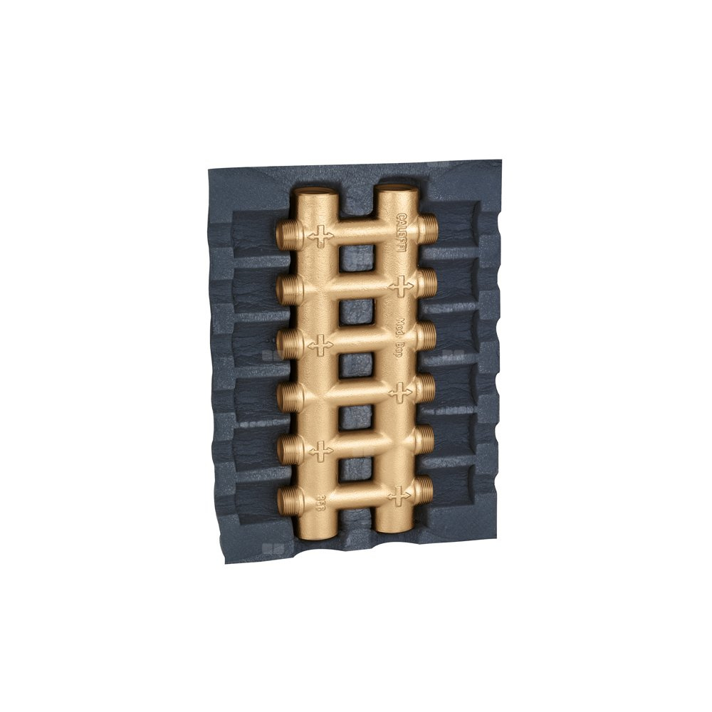 Rozdzielacz podwójny - monoblok Z izolacją. Dla instalacji grzewczych i chłodniczych. Przyłącze: G 1" (ISO 228-1) GW, Podłączenie do złączek Caleffi. przyłącza wylot: 23 p.1,5, 8 wyjść. Maksymalne ciśnienie pracy: 10 bar. Zakres temperatury medium: 0–100 °C. Rozstaw przyłączy głównych: 60 mm. Rozstaw wyjść: 40 mm.
