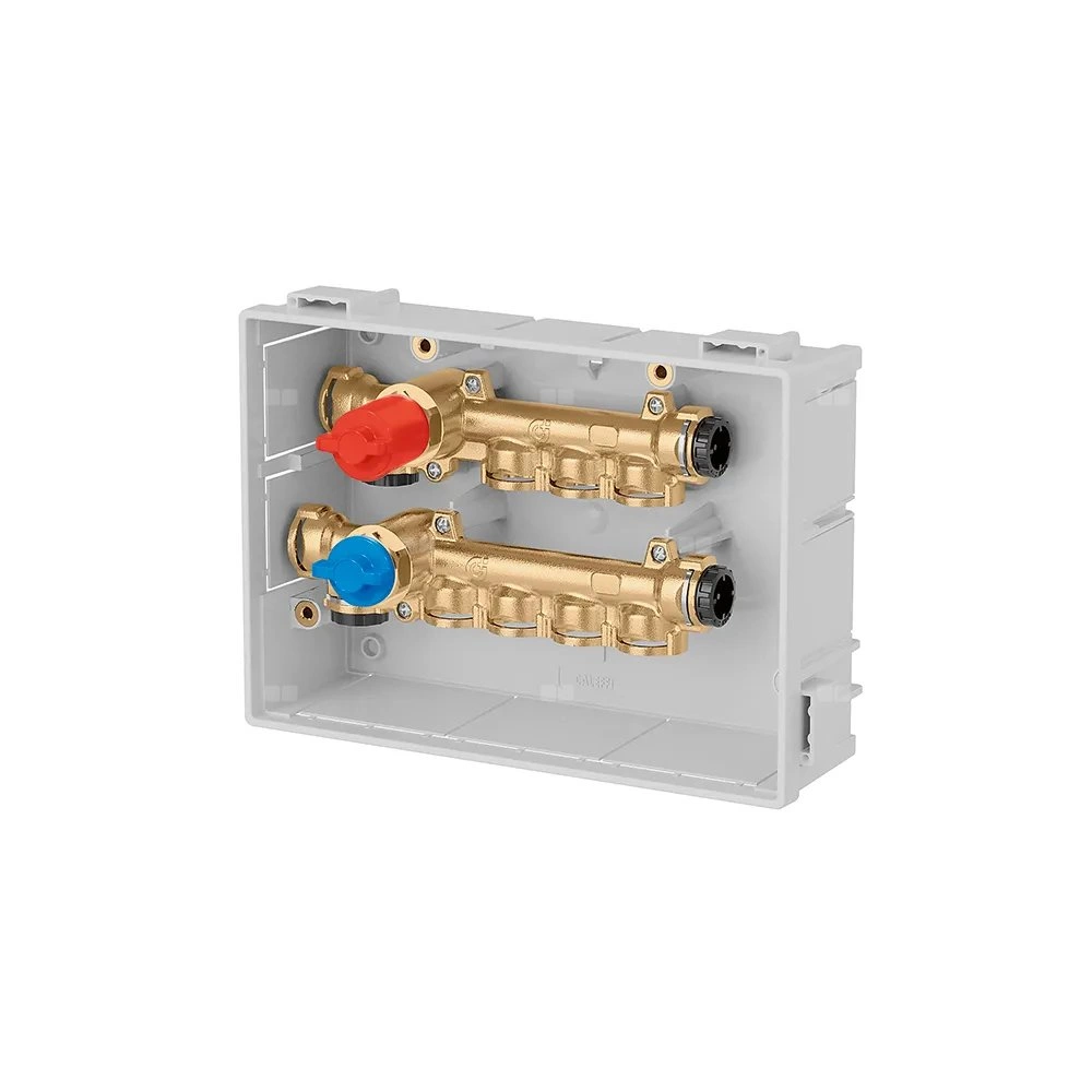 Rozdzielacz z głównymi zaworami odcinającymi z możliwością kontroli W komplecie: - para rozdzielaczy z zaworami odcinającymi; - skrzynka rozdzielacza (270 x 190 x 80 mm) wyposażona we wsporniki i elementy mocujące; - pokrywa zabezpieczająca w trakcie montażu; - 4 zaślepki z klipsami mocującymi. przyłącze zimna wylot: 4 wyjścia , podłączenie zaciskowe. przyłącze ciepła wylot: 3 wyjścia , podłączenie zaciskowe. Maksymalne ciśnienie pracy: 10 bar. Zakres temperatury medium: 5–90 °C. Rozstaw wyjść: 32 mm. Materiał: mosiądz.