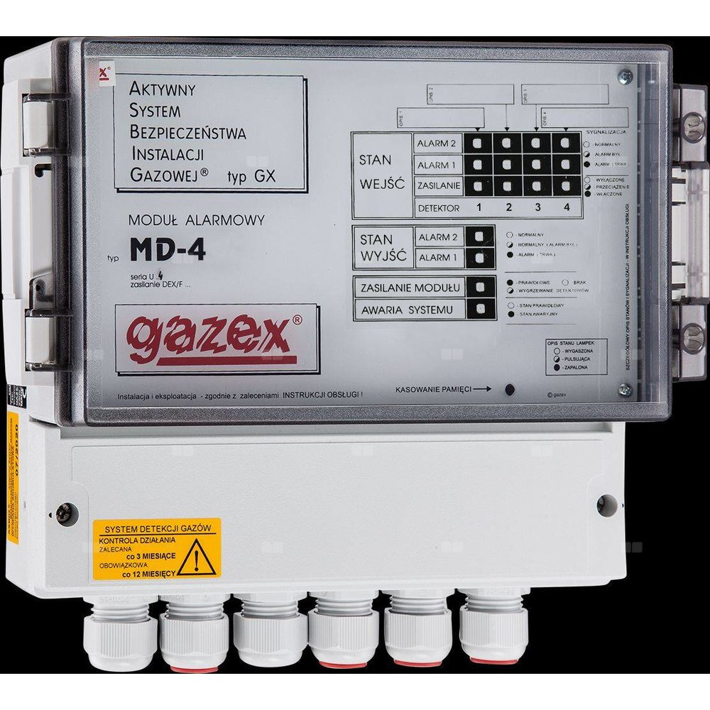 Pomiarowe moduły alarmowe typu MDP-4(8,16) są przeznaczone do kontroli i zasilania detektorów gazów typu DEX/F, DEX/P, DEX/A oraz DG/F, DG.EN, DG/P produkowanych przez GAZEX, do stosowania w Dwuprogowym (lub Pomiarowym) Systemie Detekcji Gazów lub w Aktywnym Systemie Bezpieczeństwa Instalacji Gazowej GX.