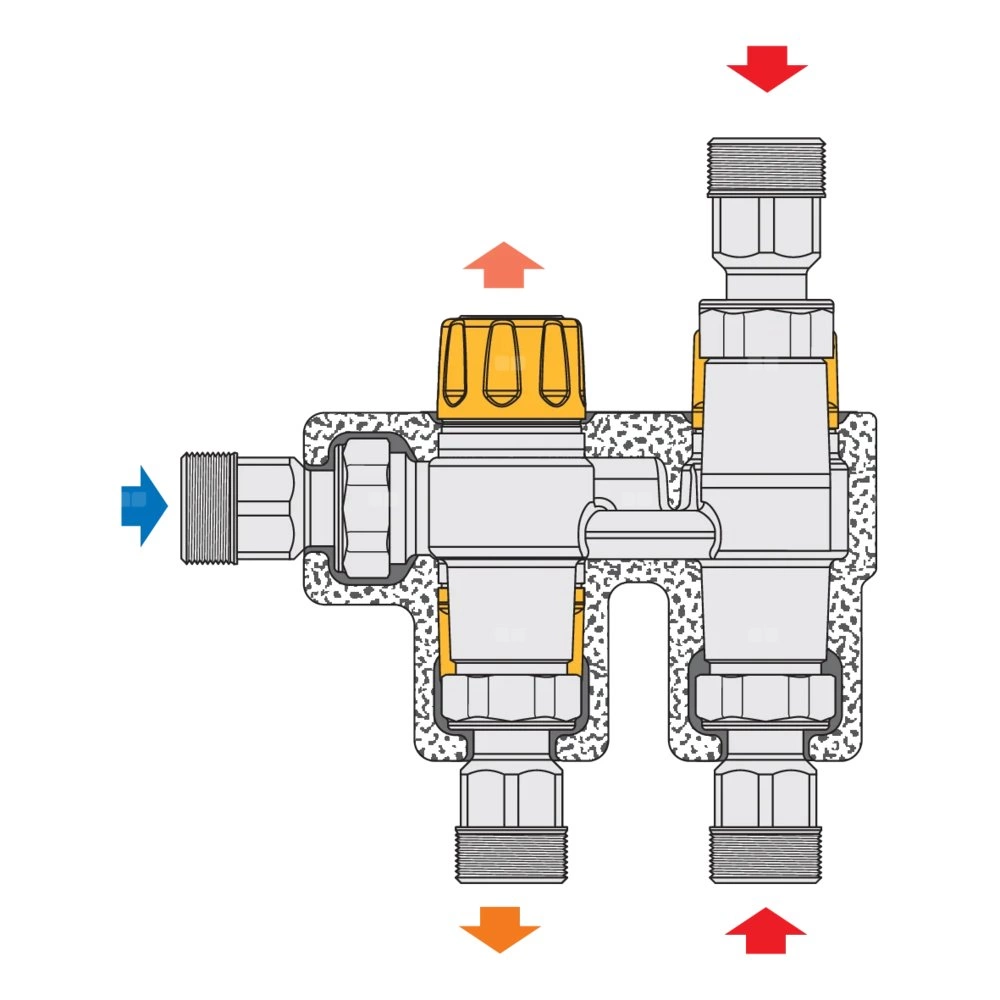 - termostatyczny antyoparzeniowy zawór mieszający regulowany przy użyciu pokrętła. Wyposażony w filtry i zawory zwrotne na wlotach;