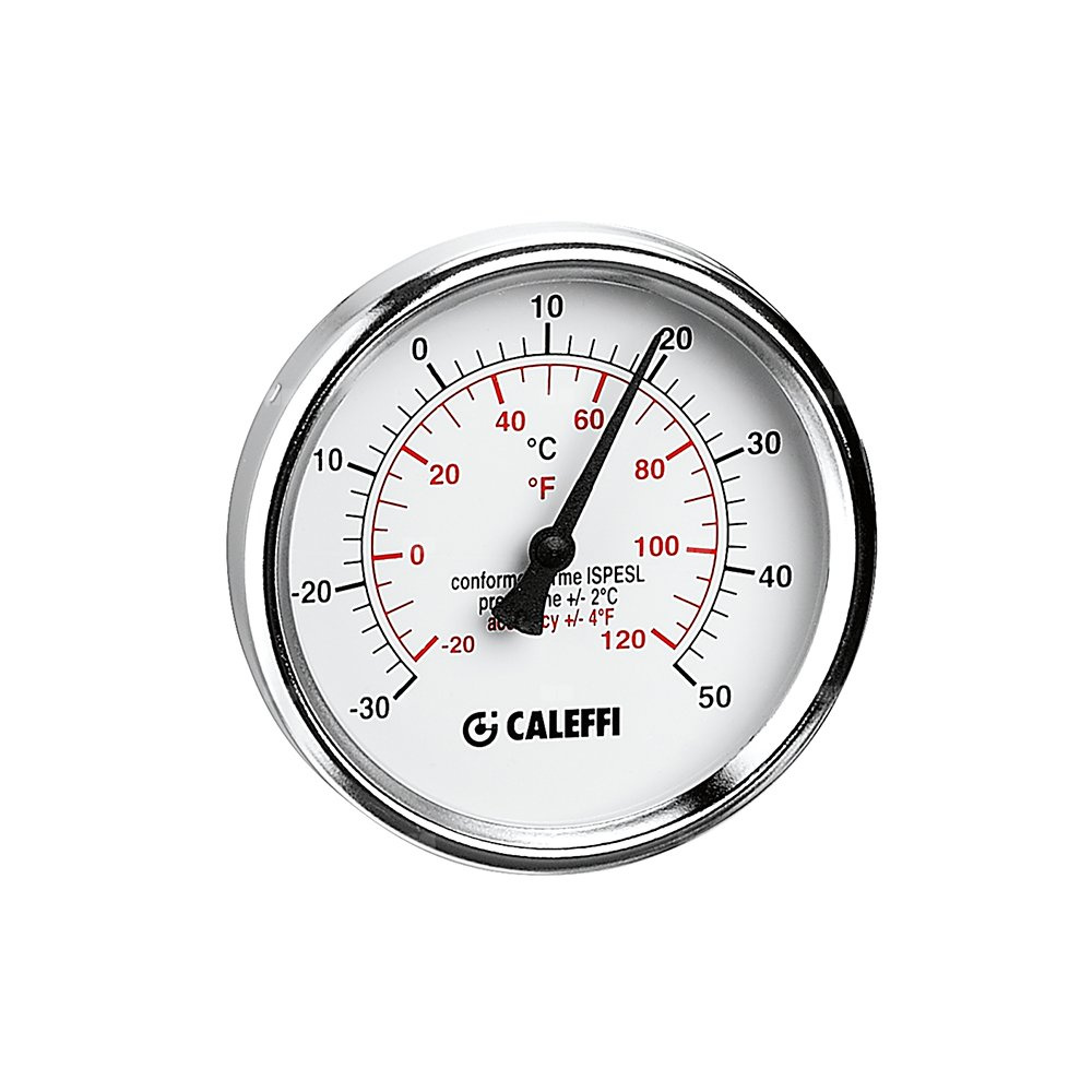 Termometr do instalacji chłodniczych Zgodny z normami INAIL (wcześniej ISPESL) Z tuleją. Przyłącze: G 1/2" A (ISO 228-1) GZ, podłączenie środkowe. Wymiary/ Średnice: Ø 80 mm. Długość tulei: 100 mm. Klasa dokładności: Termometr UNI 2. Skala termometru: -30–50 °C.
