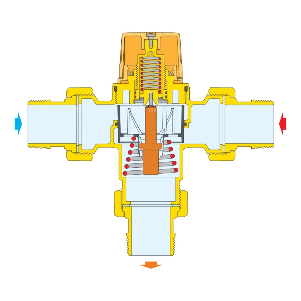 Termostatyczny zawór mieszający do scentralizowanych instalacji solarnych Wewnętrzny element regulacyjny wykonany z technopolimeru zabezpieczony przed osadzaniem kamienia. Przyłącze: R 3/4" (EN 10226-1) GZ, złączka. Maksymalne ciśnienie pracy: 14 bar. Zakres temperatury medium: 0–100 °C. Zakres regulacji temperatury: 35–65 °C. Kv: 4,5 m³/h. Materiał: stop mosiądzu odporny na odcynkowanie.