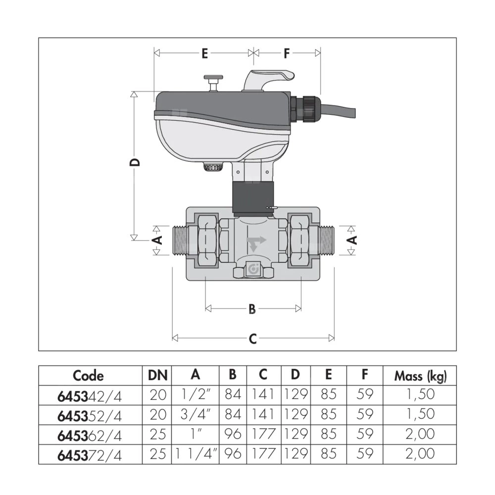 Trójdrożny zawór kulowy z napędem do instalacji grzewczych i chłodniczych Z mikroprzełącznikiem pomocniczym Z dźwignią ręczną. Przyłącze: G 1 1/4" A (ISO 228-1) GZ. Maksymalne ciśnienie pracy: 10 bar. Zakres temperatury medium: -10–110 °C. Zakres temperatury otoczenia: -10–55 °C. Zasilanie elektryczne: 24 V (AC). Pobór mocy: 6 VA. Stopień ochrony: IP 65. Długość przewodu zasilająego: 0,8 m. Styk mikroprzełącznika pomocniczego (230 V): 6 (2) A. △p max.: 10 bar. Kv przelot: 36,00 m³/h. Kv obejście: 3,80 m³/h. Czas zadziałania: 50 s (obrót 90°).