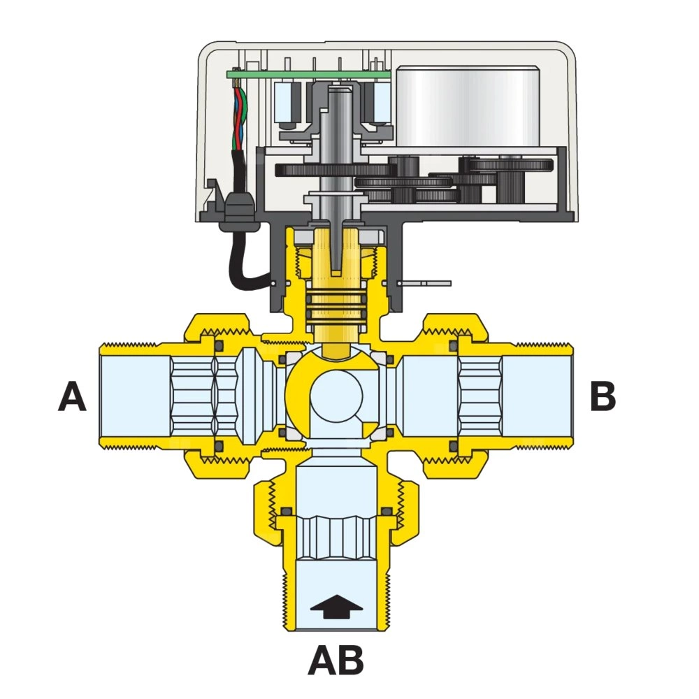 Trójdrożny rozdzielający zawór kulowy z napędem. Z siłownikiem ze sterowaniem 3-punktowym. Z mikroprzełącznikiem pomocniczym. Cz
