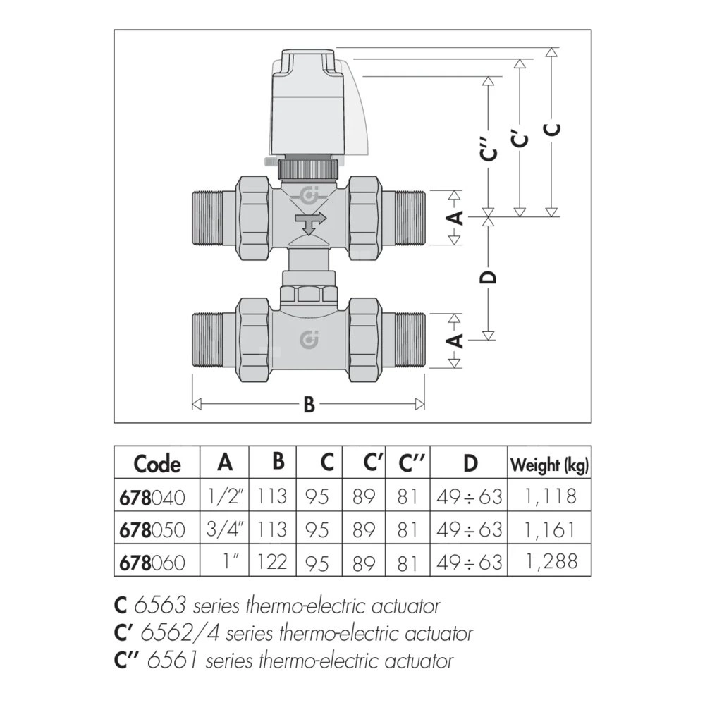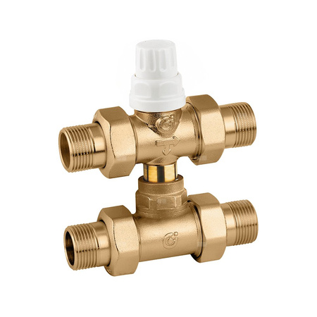 Trójdrożny zawór strefowy z trójnikiem obejściowym. Przystosowany do siłowników termoelektrycznych serii 6563, 6561, 6562 i 6564. Regulowana odległość środkowych otworów wylotowych od 49 do 63 mm. Trójnik z dyszą U6. Przyłącze: G 1/2" A (ISO 228-1) GZ. Maksymalne ciśnienie pracy: 10 bar. Zakres temperatury medium: 0–95 °C. △p max.: 1,2 bar. Kv przelot: 3,7 m³/h. Kv obejście: 1,0 m³/h.