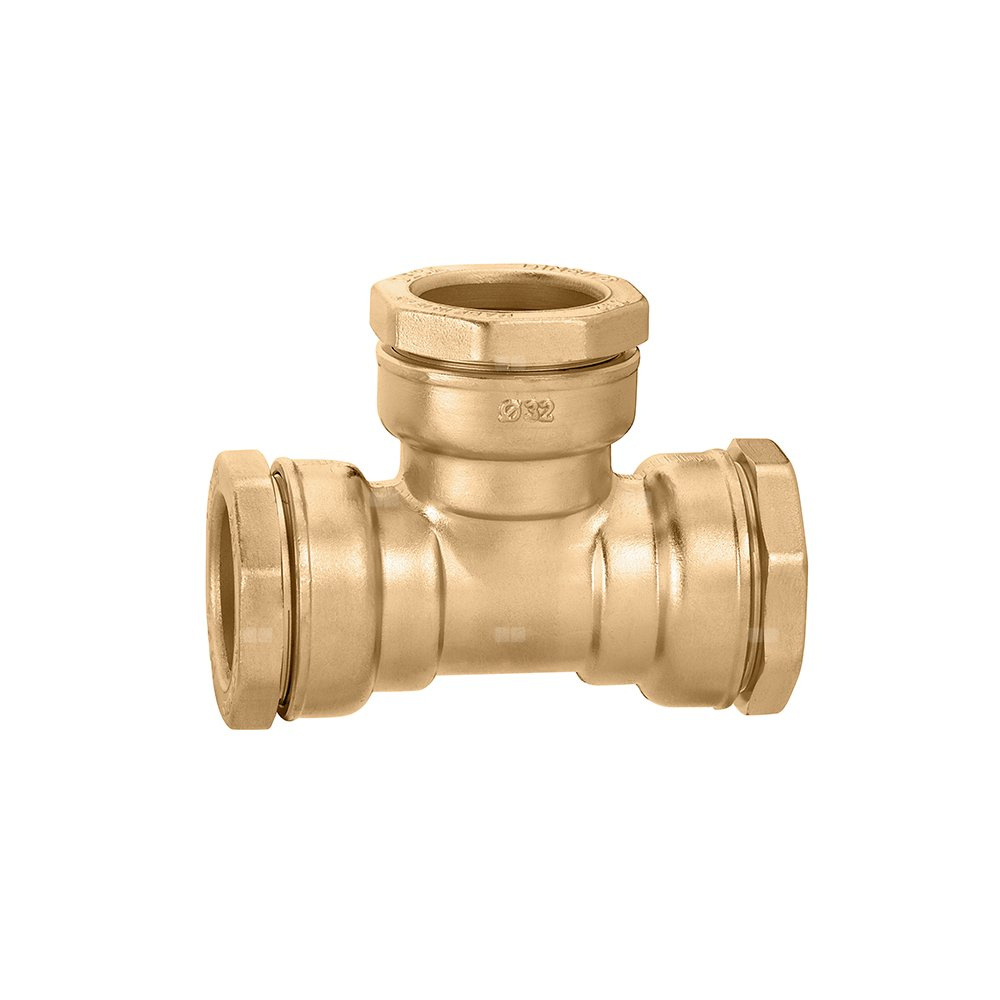 Trójnik. Do rur polietylenowych. Przyłącze: Ø 25. Maksymalne ciśnienie pracy: 16 bar. Zakres temperatury medium: 0–40 °C. Materiał: mosiądz.